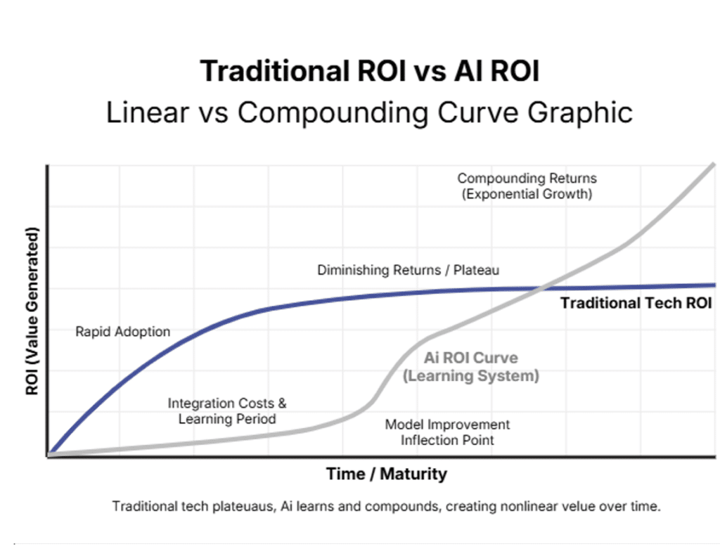 Traditional ROI assumes diminishing returns. AI delivers compounding returns. The first hundred predictions a model makes are less accurate than the ten-thousandth.
