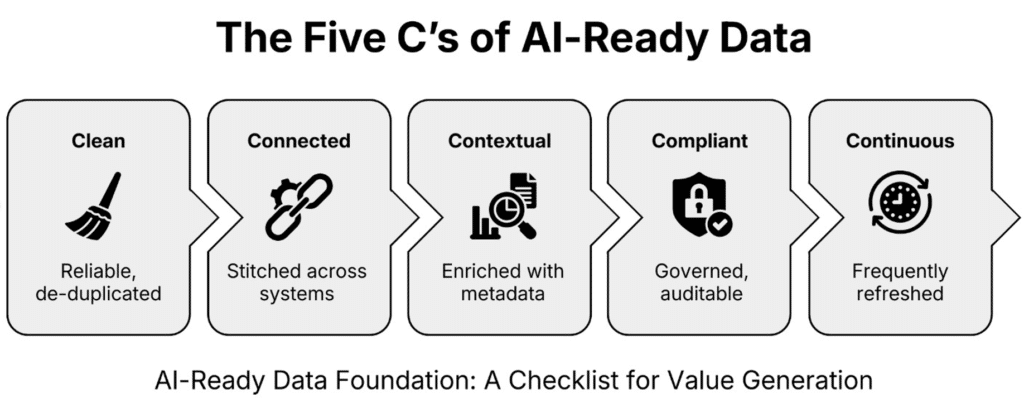 We use a framework called the Five C’s to diagnose AI data readiness. Every word matters: